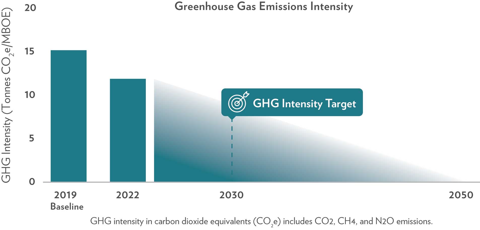 - Reduce our Scope 1 and Scope 2 GHG emissions intensity 50% by 2030 from our 2019 baseline