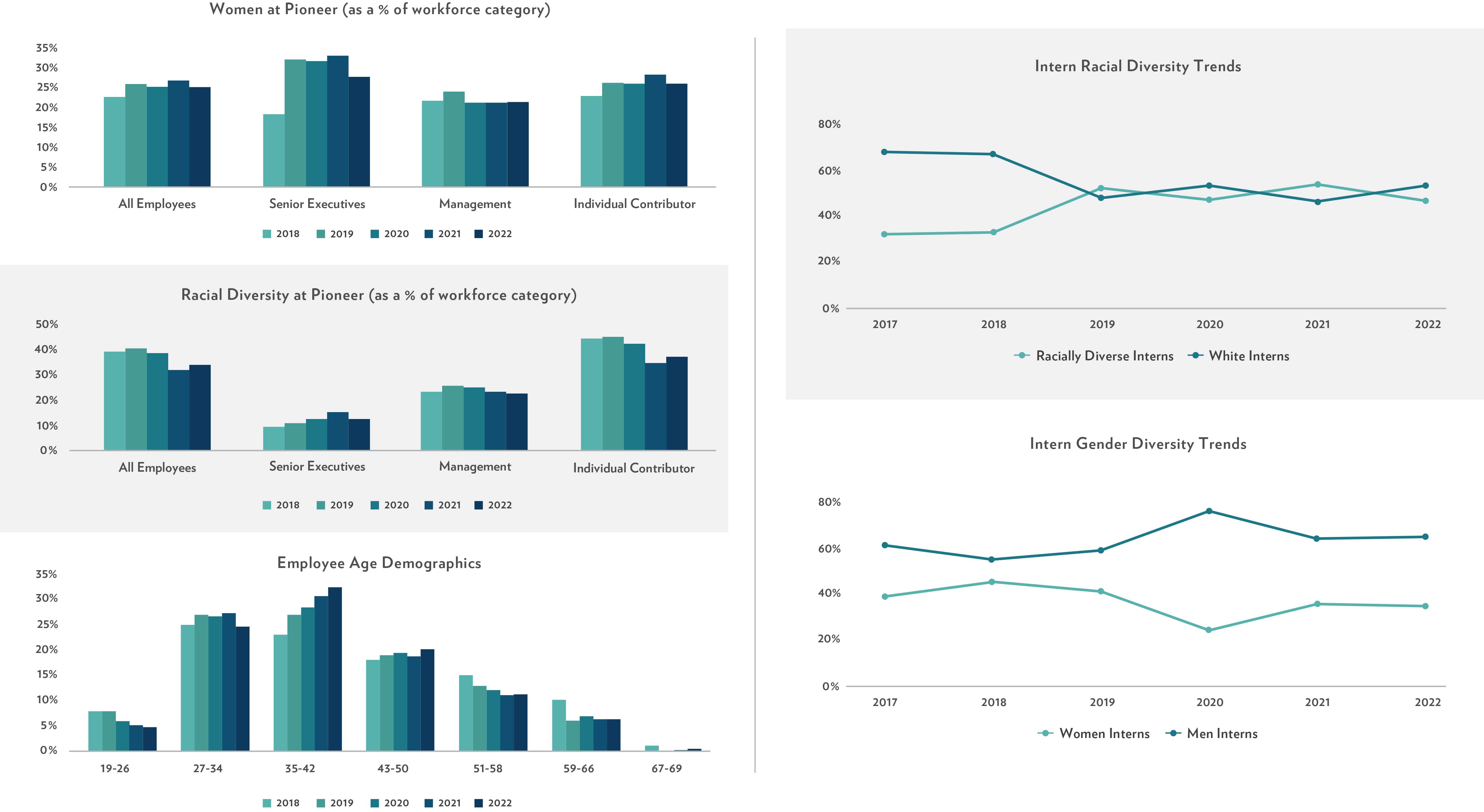 In 2022, women represented 25% of our workforce, including 28% of senior executives and 31% of our Board. The overall population of racially diverse employees has decreased since 2019 due to the sale of Pioneer’s integrated service companies; however, we continue to achieve steady growth since then within senior executive and Board representation. Pioneer actively leverages our Campus Recruiting program to diversify our pipeline of incoming talent. The Executive Committee purposefully reviews the demographics of our employee base and intentionally monitors the advancement of diversity at all levels of the company. Increased awareness of the demographic trends throughout the talent life cycle can give us insight into the future of the company and enable us to provide opportunities for all employees, ensure all voices are heard and better outcomes reached, all while we meet our DEI representation goals.